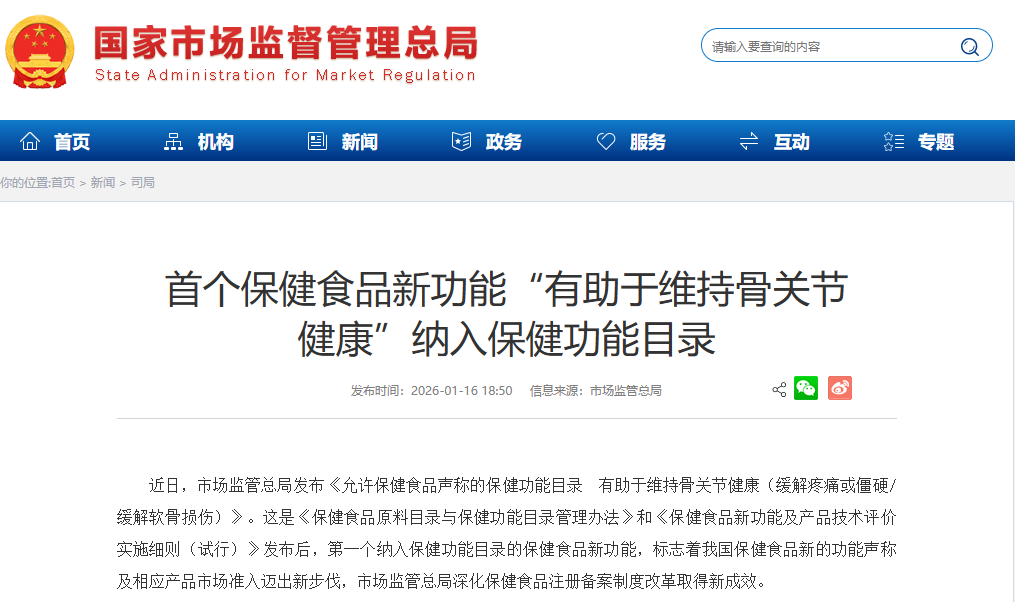 1月16日,国家市场监管总局正式发布《允许保健食品声称的保健功能目录非营养素补充剂(2026年版)》,首次将“有助于维持骨关节健康”列入保健功能目录。该功能明确涵盖了“缓解疼痛或僵硬”及“缓解软骨损伤”两大核心诉求。